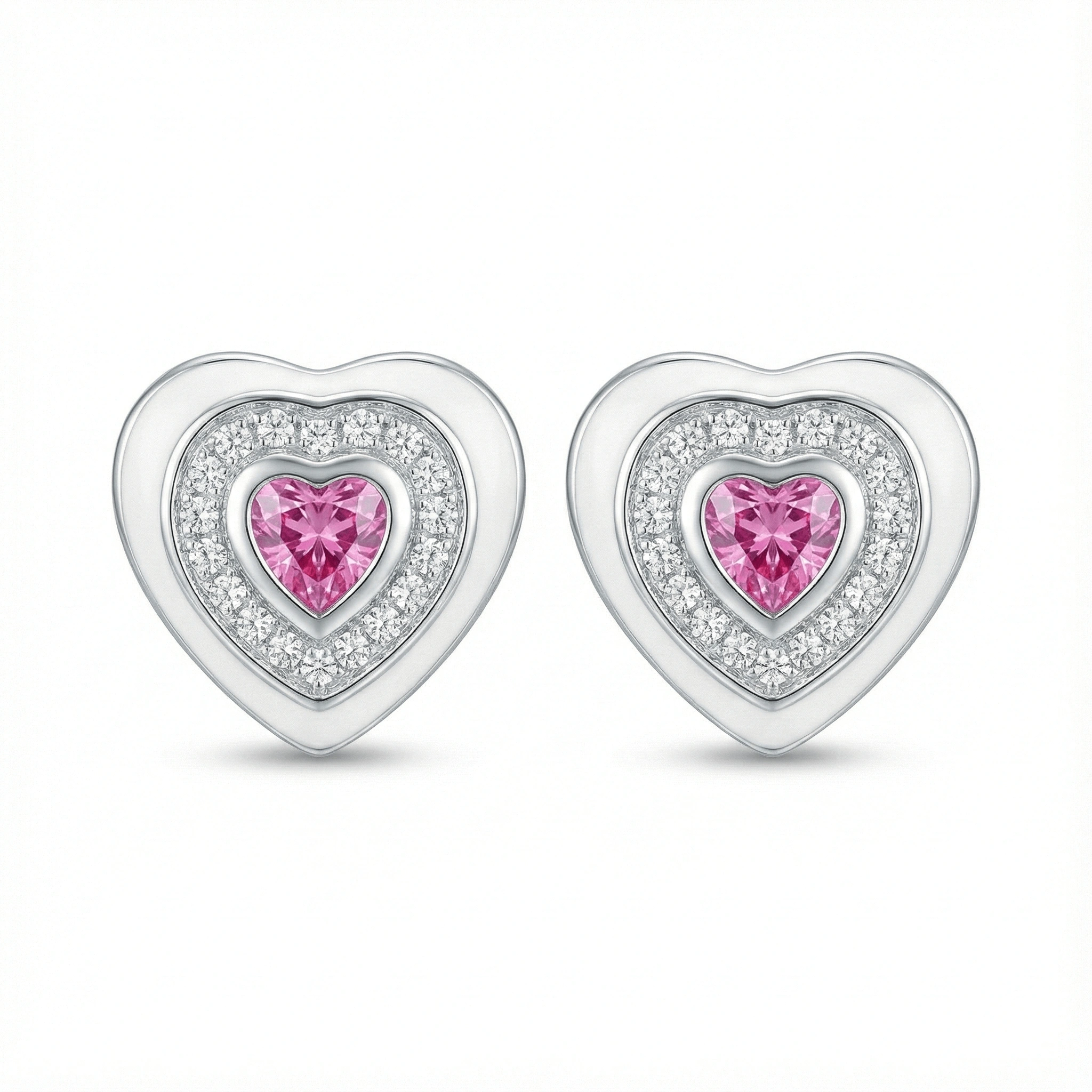 Aretes en forma de corazón en plata 925 con circones y esmaltado blanco.