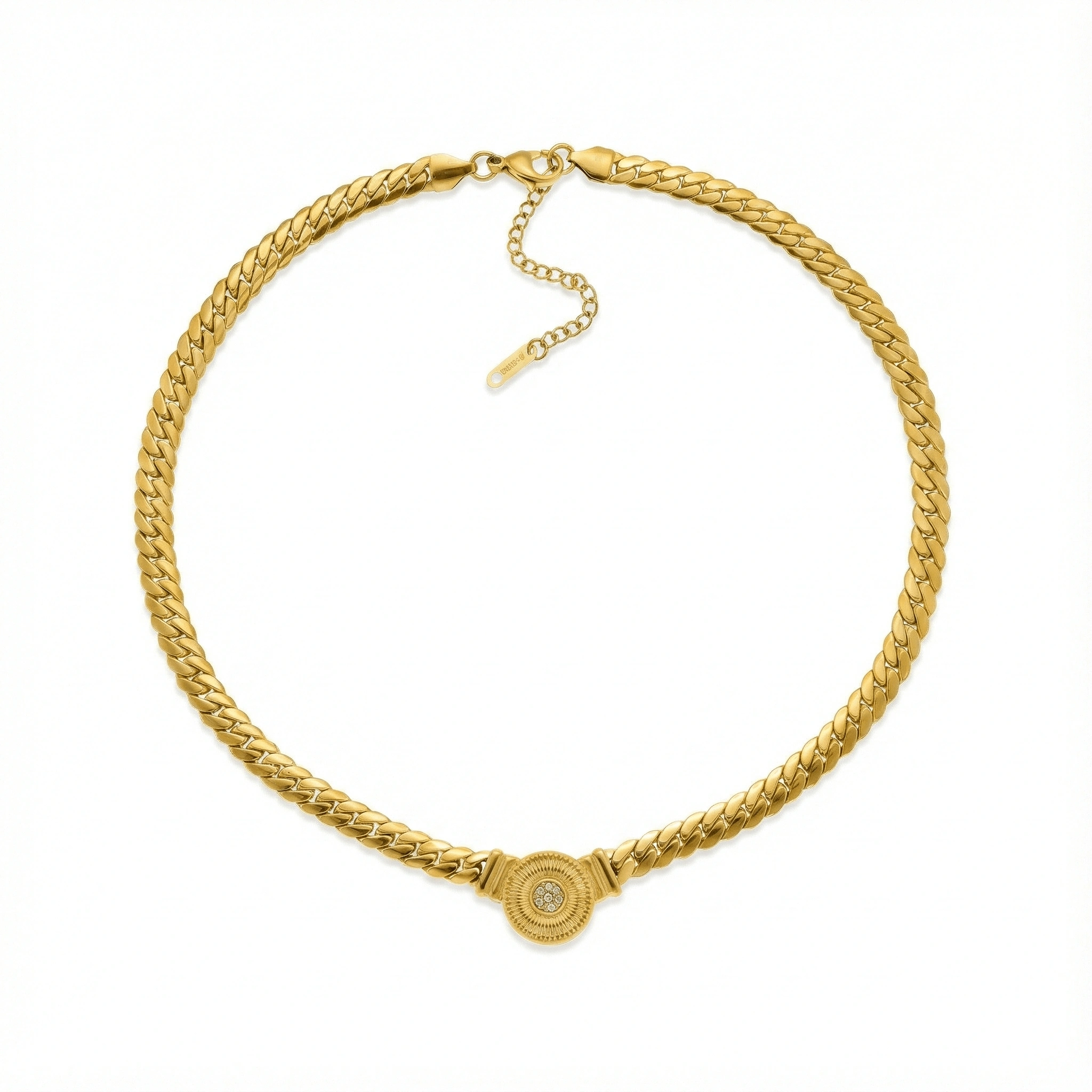 Gargantilla en acero inoxidable 316l enchapado en oro 18k con dije central en forma circular con circones