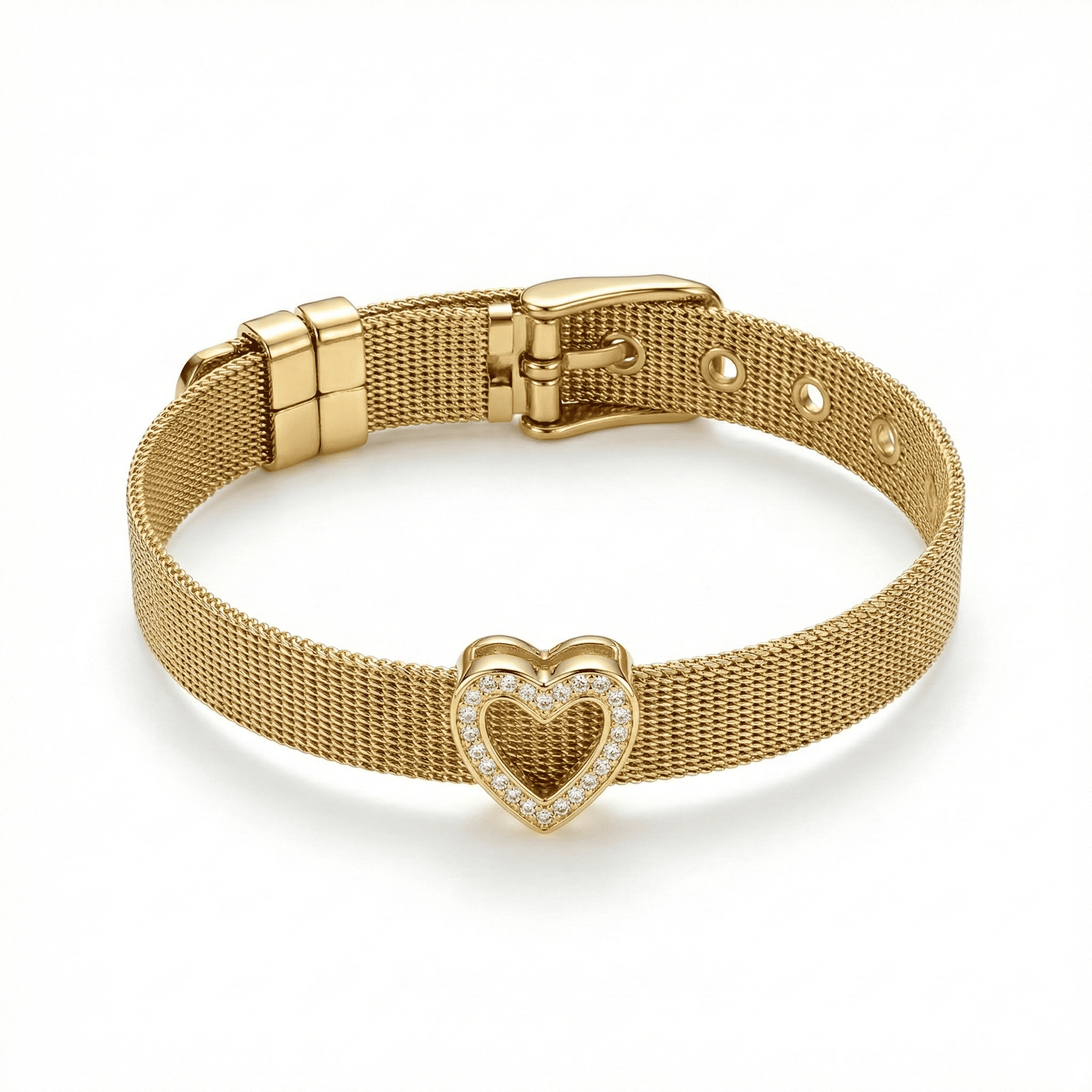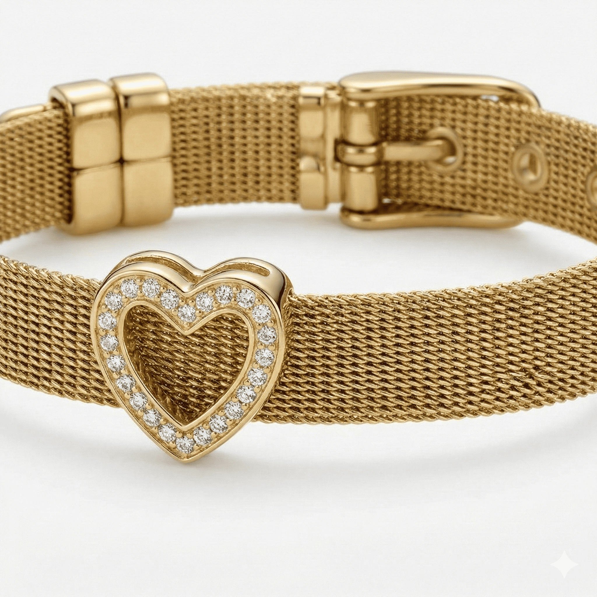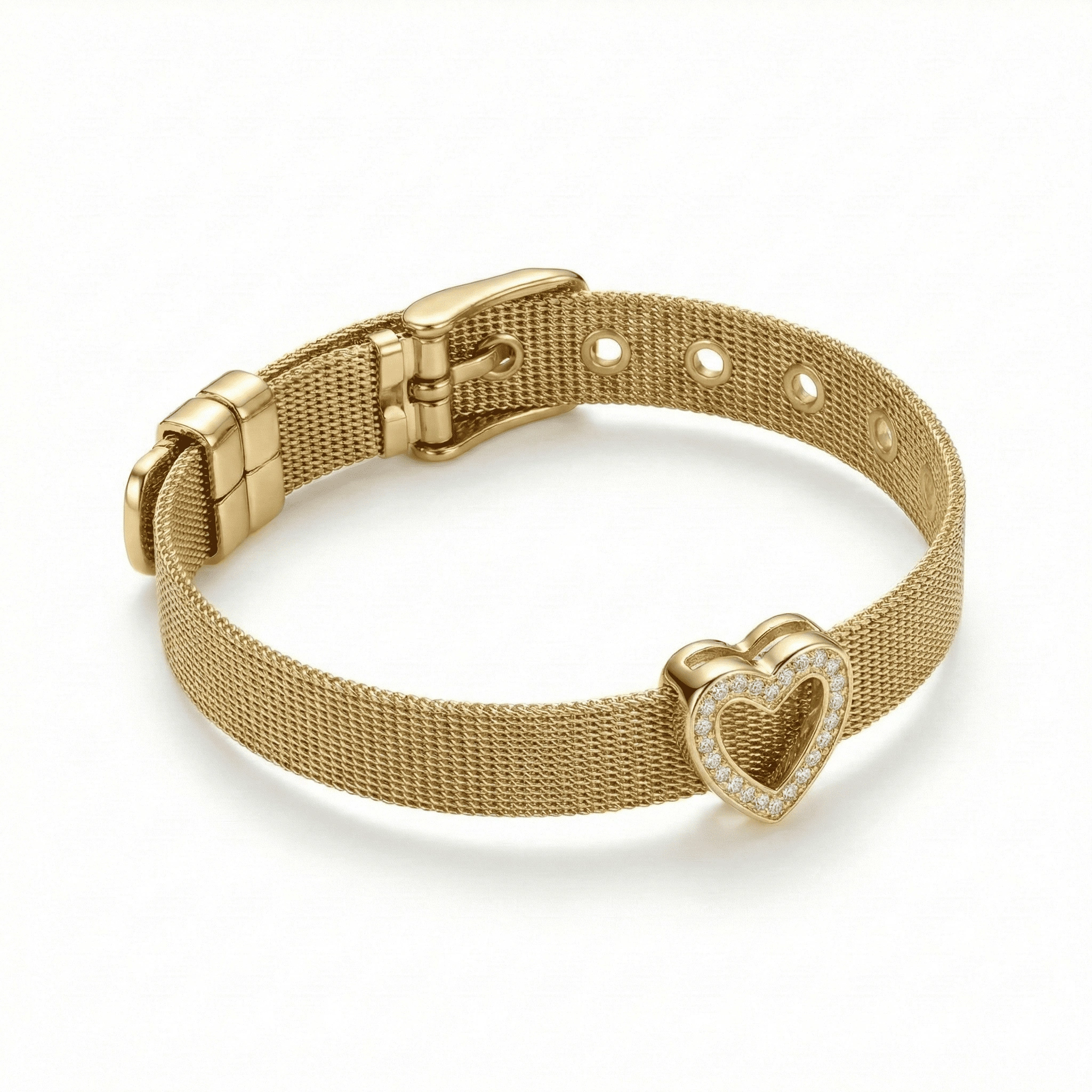 Pulsera tipo correa en acero inoxidable con enchape de oro 18k con dije removible en forma de corazón con circones.